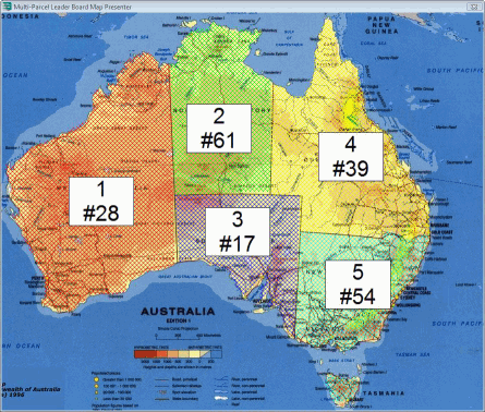 To the right is an example of our map leader board. As you can see this feature starts with an aerial shot and then overlays the parcels with color coded shading to indicate who is currently the leader on a particular parcel or combination of parcels.